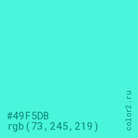 Цвет #49F5DB в цветовой модели RGB обозначается тремя октетами (73, 245, 219) в десятичном формате и #49F5DB в шестнадцатиричном (hex) формате, которые являются интенсивностью красного 73 (hex 49), интенсивность зелёного 245 (hex F5) и интенсивность синего 219 (hex DB).