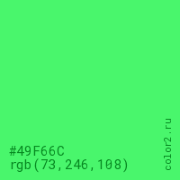 Цвет #49F66C в цветовой модели RGB обозначается тремя октетами (73, 246, 108) в десятичном формате и #49F66C в шестнадцатиричном (hex) формате, которые являются интенсивностью красного 73 (hex 49), интенсивность зелёного 246 (hex F6) и интенсивность синего 108 (hex 6C).