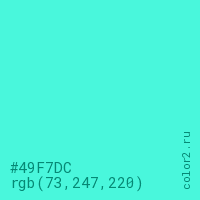 Цвет #49F7DC в цветовой модели RGB обозначается тремя октетами (73, 247, 220) в десятичном формате и #49F7DC в шестнадцатиричном (hex) формате, которые являются интенсивностью красного 73 (hex 49), интенсивность зелёного 247 (hex F7) и интенсивность синего 220 (hex DC).