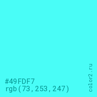 Цвет #49FDF7 в цветовой модели RGB обозначается тремя октетами (73, 253, 247) в десятичном формате и #49FDF7 в шестнадцатиричном (hex) формате, которые являются интенсивностью красного 73 (hex 49), интенсивность зелёного 253 (hex FD) и интенсивность синего 247 (hex F7).