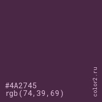 Цвет #4A2745 в цветовой модели RGB обозначается тремя октетами (74, 39, 69) в десятичном формате и #4A2745 в шестнадцатиричном (hex) формате, которые являются интенсивностью красного 74 (hex 4A), интенсивность зелёного 39 (hex 27) и интенсивность синего 69 (hex 45).