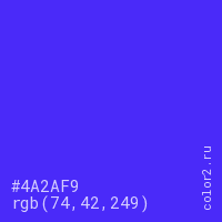 Цвет #4A2AF9 в цветовой модели RGB обозначается тремя октетами (74, 42, 249) в десятичном формате и #4A2AF9 в шестнадцатиричном (hex) формате, которые являются интенсивностью красного 74 (hex 4A), интенсивность зелёного 42 (hex 2A) и интенсивность синего 249 (hex F9).