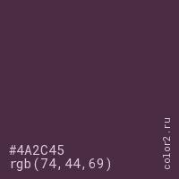 Цвет #4A2C45 в цветовой модели RGB обозначается тремя октетами (74, 44, 69) в десятичном формате и #4A2C45 в шестнадцатиричном (hex) формате, которые являются интенсивностью красного 74 (hex 4A), интенсивность зелёного 44 (hex 2C) и интенсивность синего 69 (hex 45).