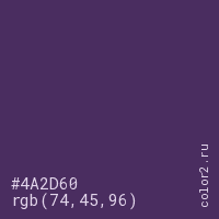 Цвет #4A2D60 в цветовой модели RGB обозначается тремя октетами (74, 45, 96) в десятичном формате и #4A2D60 в шестнадцатиричном (hex) формате, которые являются интенсивностью красного 74 (hex 4A), интенсивность зелёного 45 (hex 2D) и интенсивность синего 96 (hex 60).