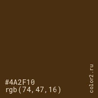 Цвет #4A2F10 в цветовой модели RGB обозначается тремя октетами (74, 47, 16) в десятичном формате и #4A2F10 в шестнадцатиричном (hex) формате, которые являются интенсивностью красного 74 (hex 4A), интенсивность зелёного 47 (hex 2F) и интенсивность синего 16 (hex 10).