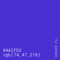 Цвет #4A2FD2 в цветовой модели RGB обозначается тремя октетами (74, 47, 210) в десятичном формате и #4A2FD2 в шестнадцатиричном (hex) формате, которые являются интенсивностью красного 74 (hex 4A), интенсивность зелёного 47 (hex 2F) и интенсивность синего 210 (hex D2).
