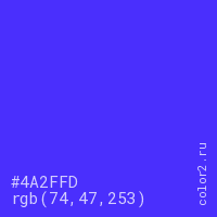 Цвет #4A2FFD в цветовой модели RGB обозначается тремя октетами (74, 47, 253) в десятичном формате и #4A2FFD в шестнадцатиричном (hex) формате, которые являются интенсивностью красного 74 (hex 4A), интенсивность зелёного 47 (hex 2F) и интенсивность синего 253 (hex FD).
