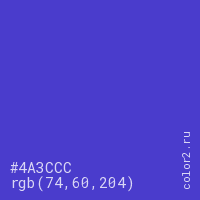 Цвет #4A3CCC в цветовой модели RGB обозначается тремя октетами (74, 60, 204) в десятичном формате и #4A3CCC в шестнадцатиричном (hex) формате, которые являются интенсивностью красного 74 (hex 4A), интенсивность зелёного 60 (hex 3C) и интенсивность синего 204 (hex CC).