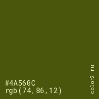 Цвет #4A560C в цветовой модели RGB обозначается тремя октетами (74, 86, 12) в десятичном формате и #4A560C в шестнадцатиричном (hex) формате, которые являются интенсивностью красного 74 (hex 4A), интенсивность зелёного 86 (hex 56) и интенсивность синего 12 (hex 0C).