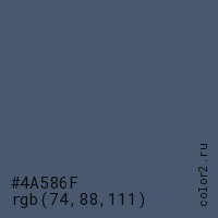Цвет #4A586F в цветовой модели RGB обозначается тремя октетами (74, 88, 111) в десятичном формате и #4A586F в шестнадцатиричном (hex) формате, которые являются интенсивностью красного 74 (hex 4A), интенсивность зелёного 88 (hex 58) и интенсивность синего 111 (hex 6F).