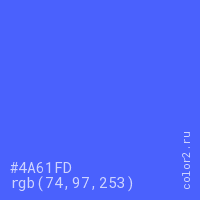 Цвет #4A61FD в цветовой модели RGB обозначается тремя октетами (74, 97, 253) в десятичном формате и #4A61FD в шестнадцатиричном (hex) формате, которые являются интенсивностью красного 74 (hex 4A), интенсивность зелёного 97 (hex 61) и интенсивность синего 253 (hex FD).