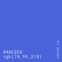 Цвет #4A63DA в цветовой модели RGB обозначается тремя октетами (74, 99, 218) в десятичном формате и #4A63DA в шестнадцатиричном (hex) формате, которые являются интенсивностью красного 74 (hex 4A), интенсивность зелёного 99 (hex 63) и интенсивность синего 218 (hex DA).