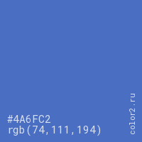 Цвет #4A6FC2 в цветовой модели RGB обозначается тремя октетами (74, 111, 194) в десятичном формате и #4A6FC2 в шестнадцатиричном (hex) формате, которые являются интенсивностью красного 74 (hex 4A), интенсивность зелёного 111 (hex 6F) и интенсивность синего 194 (hex C2).