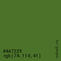Цвет #4A7229 в цветовой модели RGB обозначается тремя октетами (74, 114, 41) в десятичном формате и #4A7229 в шестнадцатиричном (hex) формате, которые являются интенсивностью красного 74 (hex 4A), интенсивность зелёного 114 (hex 72) и интенсивность синего 41 (hex 29).