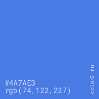 Цвет #4A7AE3 в цветовой модели RGB обозначается тремя октетами (74, 122, 227) в десятичном формате и #4A7AE3 в шестнадцатиричном (hex) формате, которые являются интенсивностью красного 74 (hex 4A), интенсивность зелёного 122 (hex 7A) и интенсивность синего 227 (hex E3).