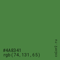 Цвет #4A8341 в цветовой модели RGB обозначается тремя октетами (74, 131, 65) в десятичном формате и #4A8341 в шестнадцатиричном (hex) формате, которые являются интенсивностью красного 74 (hex 4A), интенсивность зелёного 131 (hex 83) и интенсивность синего 65 (hex 41).