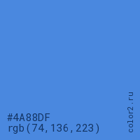 Цвет #4A88DF в цветовой модели RGB обозначается тремя октетами (74, 136, 223) в десятичном формате и #4A88DF в шестнадцатиричном (hex) формате, которые являются интенсивностью красного 74 (hex 4A), интенсивность зелёного 136 (hex 88) и интенсивность синего 223 (hex DF).