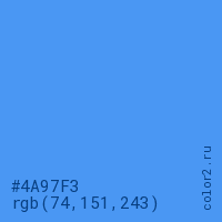 Цвет #4A97F3 в цветовой модели RGB обозначается тремя октетами (74, 151, 243) в десятичном формате и #4A97F3 в шестнадцатиричном (hex) формате, которые являются интенсивностью красного 74 (hex 4A), интенсивность зелёного 151 (hex 97) и интенсивность синего 243 (hex F3).