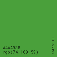 Цвет #4AA03B в цветовой модели RGB обозначается тремя октетами (74, 160, 59) в десятичном формате и #4AA03B в шестнадцатиричном (hex) формате, которые являются интенсивностью красного 74 (hex 4A), интенсивность зелёного 160 (hex A0) и интенсивность синего 59 (hex 3B).