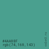 Цвет #4AA08F в цветовой модели RGB обозначается тремя октетами (74, 160, 143) в десятичном формате и #4AA08F в шестнадцатиричном (hex) формате, которые являются интенсивностью красного 74 (hex 4A), интенсивность зелёного 160 (hex A0) и интенсивность синего 143 (hex 8F).