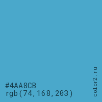 Цвет #4AA8CB в цветовой модели RGB обозначается тремя октетами (74, 168, 203) в десятичном формате и #4AA8CB в шестнадцатиричном (hex) формате, которые являются интенсивностью красного 74 (hex 4A), интенсивность зелёного 168 (hex A8) и интенсивность синего 203 (hex CB).