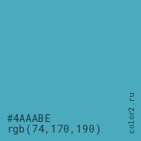 Цвет #4AAABE в цветовой модели RGB обозначается тремя октетами (74, 170, 190) в десятичном формате и #4AAABE в шестнадцатиричном (hex) формате, которые являются интенсивностью красного 74 (hex 4A), интенсивность зелёного 170 (hex AA) и интенсивность синего 190 (hex BE).