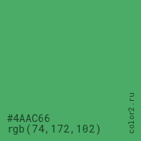 Цвет #4AAC66 в цветовой модели RGB обозначается тремя октетами (74, 172, 102) в десятичном формате и #4AAC66 в шестнадцатиричном (hex) формате, которые являются интенсивностью красного 74 (hex 4A), интенсивность зелёного 172 (hex AC) и интенсивность синего 102 (hex 66).