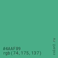 Цвет #4AAF89 в цветовой модели RGB обозначается тремя октетами (74, 175, 137) в десятичном формате и #4AAF89 в шестнадцатиричном (hex) формате, которые являются интенсивностью красного 74 (hex 4A), интенсивность зелёного 175 (hex AF) и интенсивность синего 137 (hex 89).