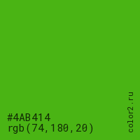 Цвет #4AB414 в цветовой модели RGB обозначается тремя октетами (74, 180, 20) в десятичном формате и #4AB414 в шестнадцатиричном (hex) формате, которые являются интенсивностью красного 74 (hex 4A), интенсивность зелёного 180 (hex B4) и интенсивность синего 20 (hex 14).