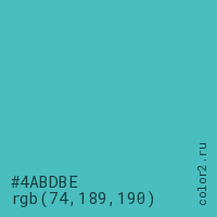 Цвет #4ABDBE в цветовой модели RGB обозначается тремя октетами (74, 189, 190) в десятичном формате и #4ABDBE в шестнадцатиричном (hex) формате, которые являются интенсивностью красного 74 (hex 4A), интенсивность зелёного 189 (hex BD) и интенсивность синего 190 (hex BE).