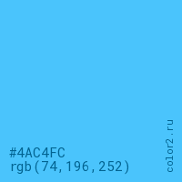 Цвет #4AC4FC в цветовой модели RGB обозначается тремя октетами (74, 196, 252) в десятичном формате и #4AC4FC в шестнадцатиричном (hex) формате, которые являются интенсивностью красного 74 (hex 4A), интенсивность зелёного 196 (hex C4) и интенсивность синего 252 (hex FC).