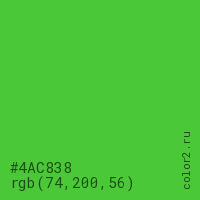 Цвет #4AC838 в цветовой модели RGB обозначается тремя октетами (74, 200, 56) в десятичном формате и #4AC838 в шестнадцатиричном (hex) формате, которые являются интенсивностью красного 74 (hex 4A), интенсивность зелёного 200 (hex C8) и интенсивность синего 56 (hex 38).