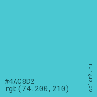 Цвет #4AC8D2 в цветовой модели RGB обозначается тремя октетами (74, 200, 210) в десятичном формате и #4AC8D2 в шестнадцатиричном (hex) формате, которые являются интенсивностью красного 74 (hex 4A), интенсивность зелёного 200 (hex C8) и интенсивность синего 210 (hex D2).