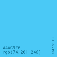 Цвет #4AC9F6 в цветовой модели RGB обозначается тремя октетами (74, 201, 246) в десятичном формате и #4AC9F6 в шестнадцатиричном (hex) формате, которые являются интенсивностью красного 74 (hex 4A), интенсивность зелёного 201 (hex C9) и интенсивность синего 246 (hex F6).