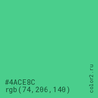 Цвет #4ACE8C в цветовой модели RGB обозначается тремя октетами (74, 206, 140) в десятичном формате и #4ACE8C в шестнадцатиричном (hex) формате, которые являются интенсивностью красного 74 (hex 4A), интенсивность зелёного 206 (hex CE) и интенсивность синего 140 (hex 8C).