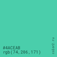 Цвет #4ACEAB в цветовой модели RGB обозначается тремя октетами (74, 206, 171) в десятичном формате и #4ACEAB в шестнадцатиричном (hex) формате, которые являются интенсивностью красного 74 (hex 4A), интенсивность зелёного 206 (hex CE) и интенсивность синего 171 (hex AB).