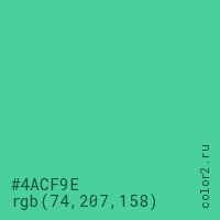 Цвет #4ACF9E в цветовой модели RGB обозначается тремя октетами (74, 207, 158) в десятичном формате и #4ACF9E в шестнадцатиричном (hex) формате, которые являются интенсивностью красного 74 (hex 4A), интенсивность зелёного 207 (hex CF) и интенсивность синего 158 (hex 9E).
