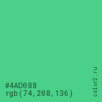 Цвет #4AD088 в цветовой модели RGB обозначается тремя октетами (74, 208, 136) в десятичном формате и #4AD088 в шестнадцатиричном (hex) формате, которые являются интенсивностью красного 74 (hex 4A), интенсивность зелёного 208 (hex D0) и интенсивность синего 136 (hex 88).