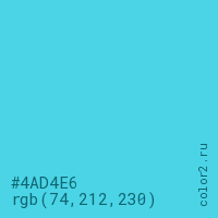 Цвет #4AD4E6 в цветовой модели RGB обозначается тремя октетами (74, 212, 230) в десятичном формате и #4AD4E6 в шестнадцатиричном (hex) формате, которые являются интенсивностью красного 74 (hex 4A), интенсивность зелёного 212 (hex D4) и интенсивность синего 230 (hex E6).