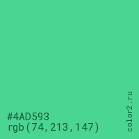 Цвет #4AD593 в цветовой модели RGB обозначается тремя октетами (74, 213, 147) в десятичном формате и #4AD593 в шестнадцатиричном (hex) формате, которые являются интенсивностью красного 74 (hex 4A), интенсивность зелёного 213 (hex D5) и интенсивность синего 147 (hex 93).