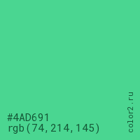 Цвет #4AD691 в цветовой модели RGB обозначается тремя октетами (74, 214, 145) в десятичном формате и #4AD691 в шестнадцатиричном (hex) формате, которые являются интенсивностью красного 74 (hex 4A), интенсивность зелёного 214 (hex D6) и интенсивность синего 145 (hex 91).
