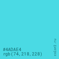 Цвет #4ADAE4 в цветовой модели RGB обозначается тремя октетами (74, 218, 228) в десятичном формате и #4ADAE4 в шестнадцатиричном (hex) формате, которые являются интенсивностью красного 74 (hex 4A), интенсивность зелёного 218 (hex DA) и интенсивность синего 228 (hex E4).