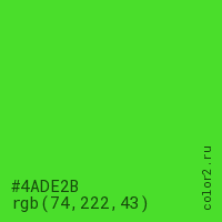 Цвет #4ADE2B в цветовой модели RGB обозначается тремя октетами (74, 222, 43) в десятичном формате и #4ADE2B в шестнадцатиричном (hex) формате, которые являются интенсивностью красного 74 (hex 4A), интенсивность зелёного 222 (hex DE) и интенсивность синего 43 (hex 2B).