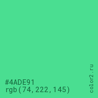 Цвет #4ADE91 в цветовой модели RGB обозначается тремя октетами (74, 222, 145) в десятичном формате и #4ADE91 в шестнадцатиричном (hex) формате, которые являются интенсивностью красного 74 (hex 4A), интенсивность зелёного 222 (hex DE) и интенсивность синего 145 (hex 91).