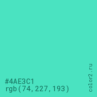 Цвет #4AE3C1 в цветовой модели RGB обозначается тремя октетами (74, 227, 193) в десятичном формате и #4AE3C1 в шестнадцатиричном (hex) формате, которые являются интенсивностью красного 74 (hex 4A), интенсивность зелёного 227 (hex E3) и интенсивность синего 193 (hex C1).