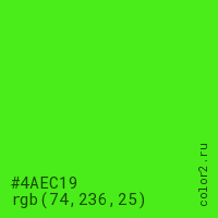Цвет #4AEC19 в цветовой модели RGB обозначается тремя октетами (74, 236, 25) в десятичном формате и #4AEC19 в шестнадцатиричном (hex) формате, которые являются интенсивностью красного 74 (hex 4A), интенсивность зелёного 236 (hex EC) и интенсивность синего 25 (hex 19).