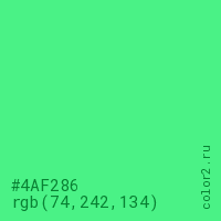 Цвет #4AF286 в цветовой модели RGB обозначается тремя октетами (74, 242, 134) в десятичном формате и #4AF286 в шестнадцатиричном (hex) формате, которые являются интенсивностью красного 74 (hex 4A), интенсивность зелёного 242 (hex F2) и интенсивность синего 134 (hex 86).