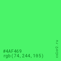Цвет #4AF469 в цветовой модели RGB обозначается тремя октетами (74, 244, 105) в десятичном формате и #4AF469 в шестнадцатиричном (hex) формате, которые являются интенсивностью красного 74 (hex 4A), интенсивность зелёного 244 (hex F4) и интенсивность синего 105 (hex 69).