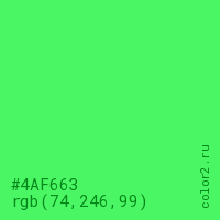 Цвет #4AF663 в цветовой модели RGB обозначается тремя октетами (74, 246, 99) в десятичном формате и #4AF663 в шестнадцатиричном (hex) формате, которые являются интенсивностью красного 74 (hex 4A), интенсивность зелёного 246 (hex F6) и интенсивность синего 99 (hex 63).