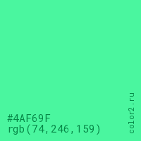 Цвет #4AF69F в цветовой модели RGB обозначается тремя октетами (74, 246, 159) в десятичном формате и #4AF69F в шестнадцатиричном (hex) формате, которые являются интенсивностью красного 74 (hex 4A), интенсивность зелёного 246 (hex F6) и интенсивность синего 159 (hex 9F).